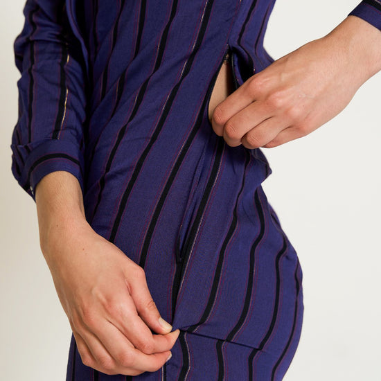 Renée est composée à 100% de viscose (pulpe de bois) et est tissé en Espagne. Le tissus arbore une couleur cassis ainsi que des rayures noires, roses et dorés.